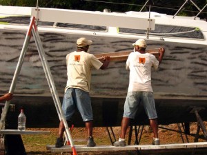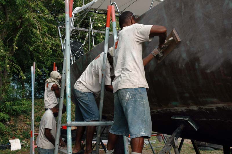 Two men can go at it in the blazing heat and humidity for about 15 minutes, and then they need a rest under the tree. So we have 3 teams of two men each. And this goes on for days and days. The resulting surface is the very opposite of smooth and glossy – that dull surface makes it very difficult to see whether the surface is in fact fair. It takes an artist’s eye to be able to “see” it at this stage (you don’t want to be noticing these glaring defects after $1000s of dollars of topcoat have been put on!)