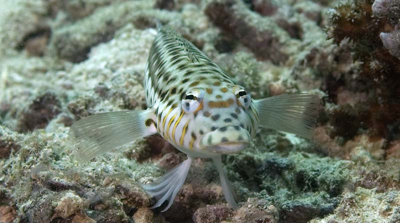 I really enjoy these little black and white striped guys. They are about 25mm high. I often see large schools of them among certain kinds of hard coral. It is very difficult to get a photo of the large schools, because they shrink back into the coral as soon as you bring the camera to bear.