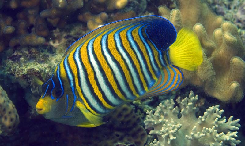 The Regal Angelfish is a popular salt-water aquarium fish. That’s unfortunate, because they are not capable of being bred in captivity, which means that somebody is snatching them from reefs, and given what I’ve heard about the techniques, it’s ugly. This site has some fascinating information about the breeding behavior of angelfish. They appear to behave like the Scale Fin Anthias with harems containing a single dominant male and one to four females. The harems exhibit a pecking-order hierarchical system of dominance. If the male is removed from the harem, the top ranking female will change to the male sex over a period of only two to three weeks, and now its her harem!